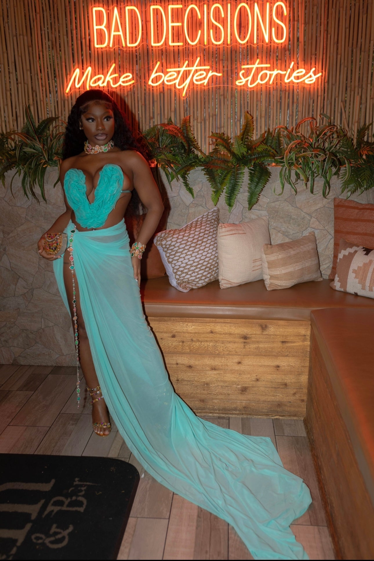 Handmade Chest plate corset top with matching draping tie up skirt in mesh.